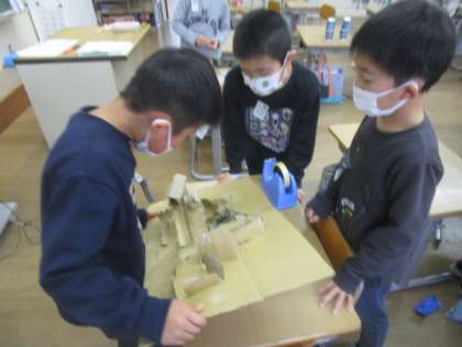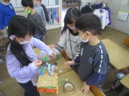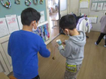 持ち寄った材料で秋のおもちゃを作りました。子供たちはお互いの作ったおもちゃで楽しく遊びました。