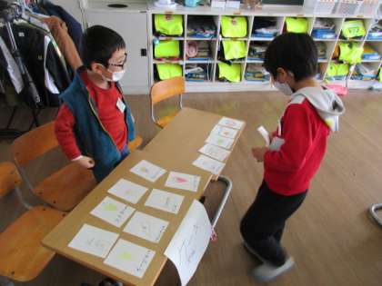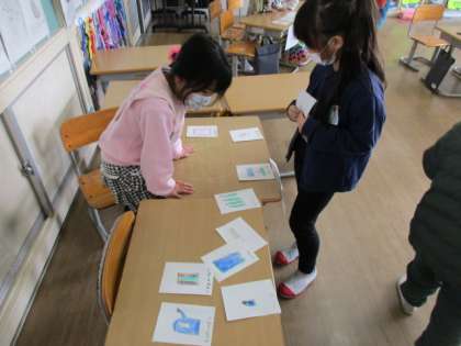 国語の「ものの名まえ」の学習で、お店やさんごっこをしました。「いらっしゃいませ」「○○をください」と、お店の人とお客さんになって買い物をしました。