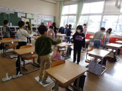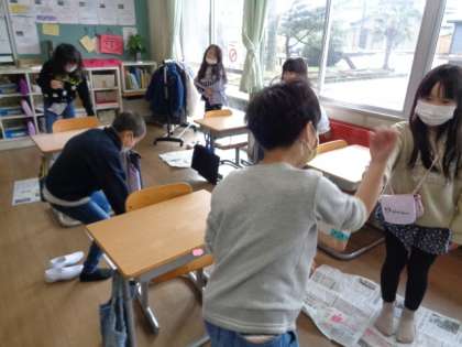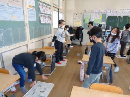 3学期の話、1月の席替え、新しい一人一役の担当を決めた後に、ペアで新聞ジャンケンで遊びました。負けるとどんどん自分の新聞が小さくなっていきます。子供たちは勝っても負けても笑顔で楽しそうに友達と遊んでいました。今学期も、みんなで仲良く、ぐんぐん成長していきましょう!