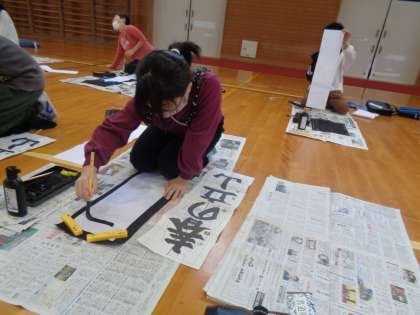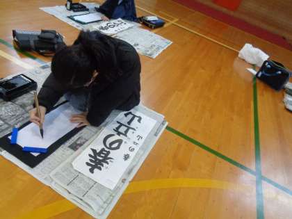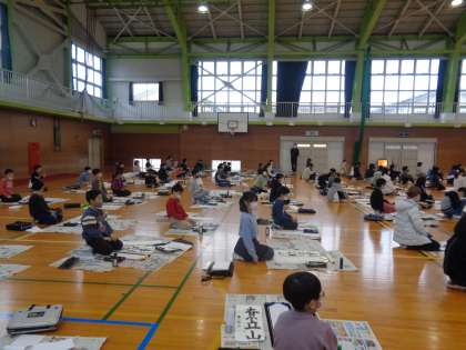 始業式後、書初大会を行いました。初めて体育館での書き初めでしたが、集中して筆を運んでいる姿が印象的でした。