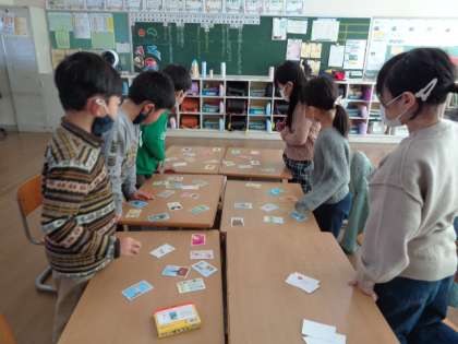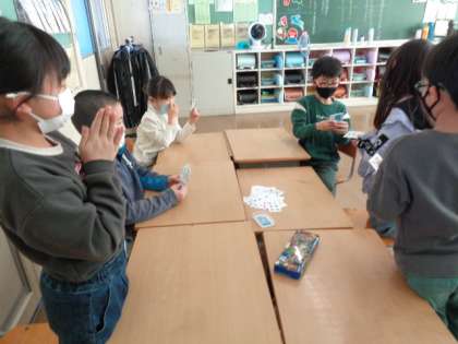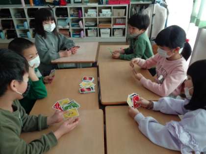 室内遊び用に教室にトランプ、ウノ、かるたが配られました。3学期の目当てを清書した後にみんなで遊んでみました。友達と楽しく遊んでほしいです。