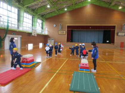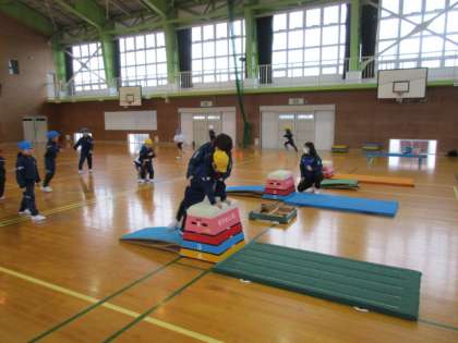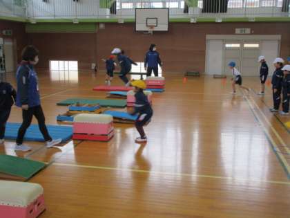 指導員の方の説明を聞いて、何度も跳び箱に向かっていく子供たち。だんだん高い跳び箱にも挑戦していきました。着地も上手に決まり、嬉しそうでした。