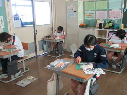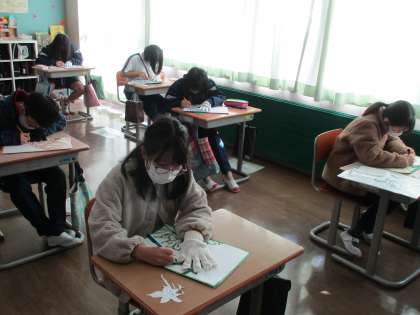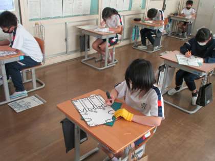 図工の学習で、ステンシル版画を制作しています。カッターの使い方に気を付け、真剣に、集中して取り組んでいます。題材はお花です。卒業を祝う期間に飾ることも目標に、進めていきます。