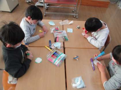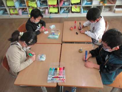 【1年生】生活科 公開日 2023/01/19 更新日 2023/01/19 1年生 来週の昔の遊び体験に向けて、生活科の時間に、「ぶんぶんごま」や「木心ごま」の色塗りをしました。回したときにきれいな色が見えるように、マジックで丁寧に色を塗りました。