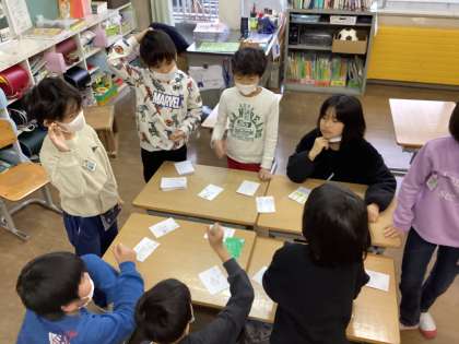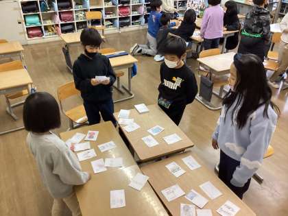 国語の学習で音訓カルタを作りました。今日はいよいよ大会の日です。みんなで作ったカルタで楽しく遊びながら漢字に親しむことができました。