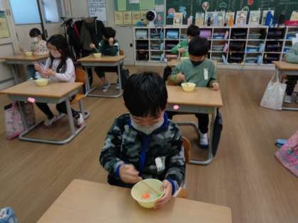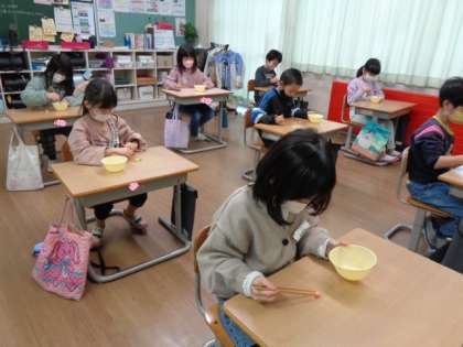 【2年生】箸の持ち方 公開日 2023/01/24 更新日 2023/01/24 2年生 学校給食週間中です。今日は栄養士の先生に正しい箸の持ち方を教わりました。「親指・人差し指・中指の3本で上の箸だけ動かす」のが難しい子が多かったです。毎回の食事の中で少しずつ意識していきましょう。