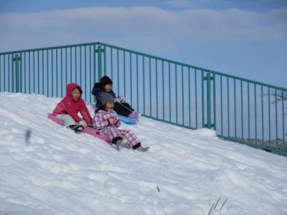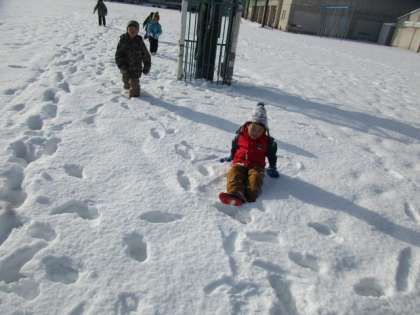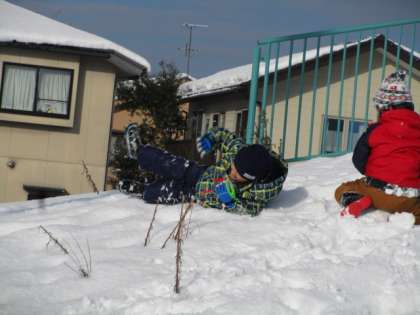 雪の上を転がったり、そりを使ったりして遊びをしている子供たちの様子です。築山の上から気持ちよさそうに滑り降りていました。