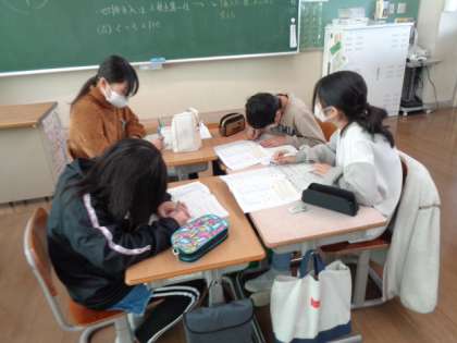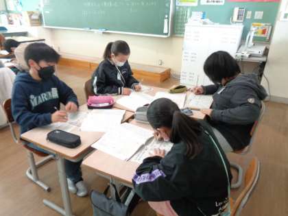 算数の学習で、帯グラフ・円グラフと学習しています。今日は、データーを元にグラフの完成を目指しました。グループの人とやり方を確認しながら進めました。