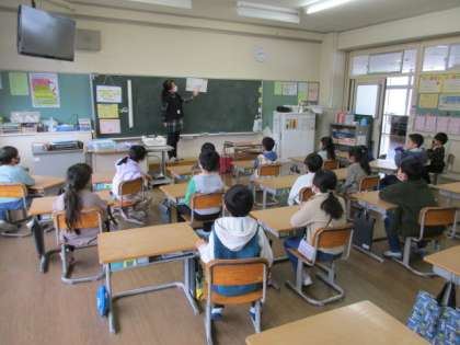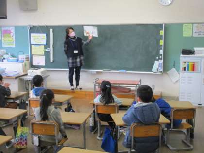 読み聞かせボランティアの方に絵本を読んでいただきました。静かに集中してきいていました。