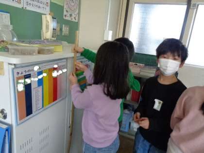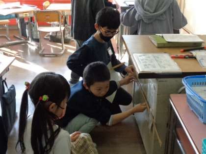 1mものさしを使って長さ調べをしました。ものさしの目盛りの読み方にも慣れ、どんどん長さを調べていました。