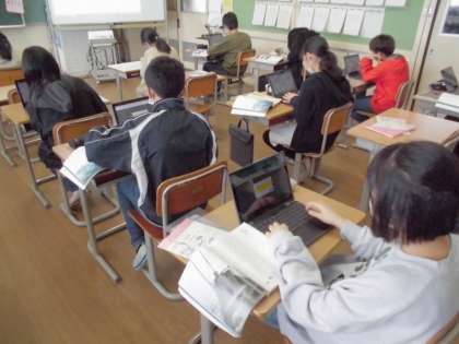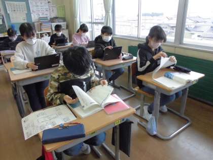 クロムブックを使ったり、紙に書き込んだりしながら、学習を進めています。