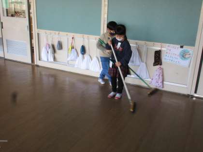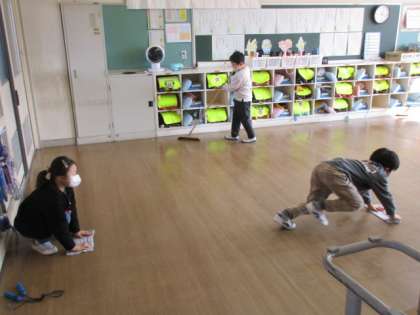 自級清掃で、教室やワークスペースの清掃をしました。入学したばかりの頃と比べると、清掃用具の使い方がずいぶん上手になりました。