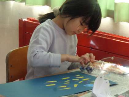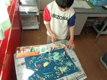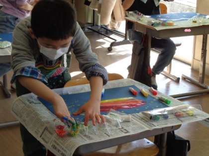 液体粘土と絵の具を混ぜた「とろとろ絵の具」を使って、手指で絵を描きました。初めての体験に子供たちは楽しそうにダイナミックに取り組んでいました。