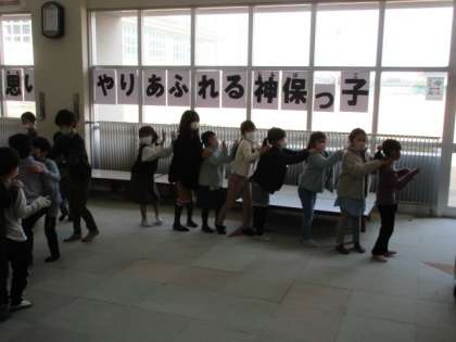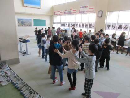 【1年生】3年生さんと一緒に音楽をしたよ その1 公開日 2023/03/08 更新日 2023/03/08 1年生 3年生のお兄さんお姉さんと一緒に音楽をしました。始めに音楽に合わせて体を動かしました。少し恥ずかしそうにしていた1年生ですが、一緒にゲームをしたことで、だんだん笑顔になっていきました。