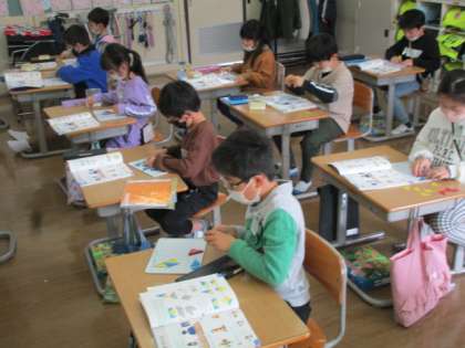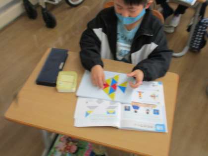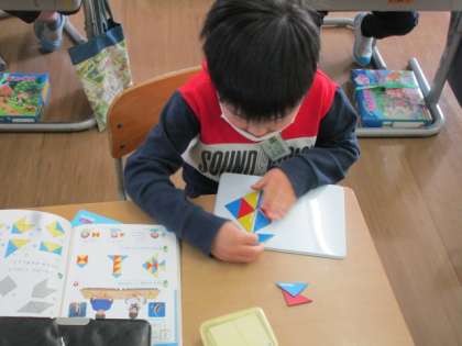 「かたちづくり」の学習で、色板を使って様々な形をつくりました。三角の色板を組み合わせて大きな三角や四角をつくり、魚やロケットに見立てて楽しみました。