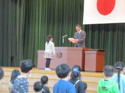 修了式では、各クラスの代表の児童が校長先生から修了証を受け取りました。体育館での子供たちは、姿勢を正し、しっかりと校長先生のお話を聞いていました。1年間の成長が感じられた姿でした。