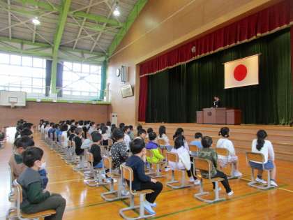 いよいよ新年度が始まりました。 子供たちは、校長先生のお話をしっかりと聞いています。