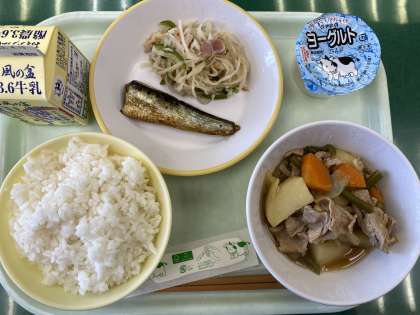 4月10日(月) 今日の給食 公開日 2023/04/10 更新日 2023/04/10 お知らせ・お願い 今日から給食がです。今日の献立は、ごはん、いわしのうめに、はりはりソテー、肉じゃが、ヨーグルト、牛乳です。 肉じゃがは、煮込まれてやわらかく、味が浸みています。今日もおいしくいただきました!