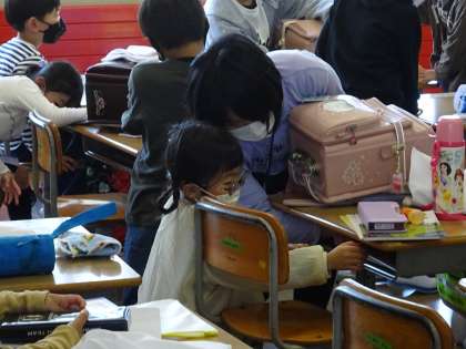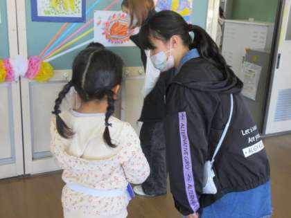 1年生と目線を合わせて接しています。最高学年としての姿がすてきですね。