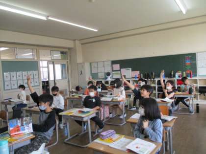 【4年生】都道府県クイズ大会開催! 公開日 2023/04/13 更新日 2023/04/13 4年生 社会科では、都道府県について学習しています。教科書や地図帳で調べた各都道府県の特徴について3ヒントクイズを行いました。子供たちは、「分かった!分かった!」「中部地方だとどこかな?」などと、クイズを通して47都道府県に興味をもっている様子が見られました。