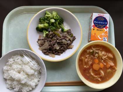 ごはん、オレンジジュース、アメリカンビーフソテー、そえやさい、白いんげん豆のトマト煮です。