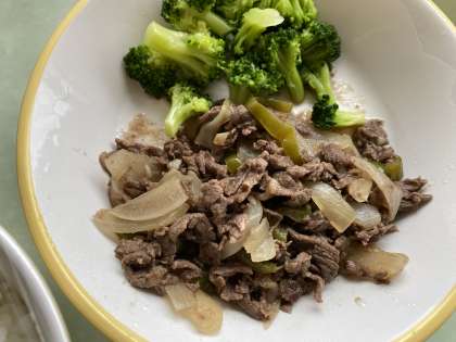 「アメリカンビーフソテー」アメリカは牛肉の生産量・消費量ともに世界一です。牛乳と玉ねぎ、ピーマンをあわせて炒めました。