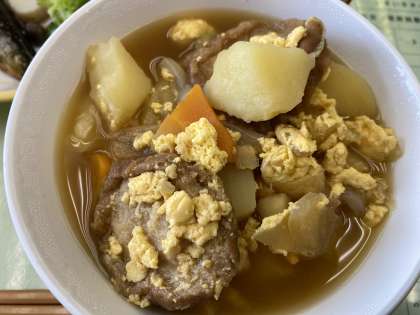 卵とじには、大きな油麩が入っています。出汁を吸っていて大きく、ブリュー無満点です。きのこのソテーのしめじやエリンギは歯ごたえがあり、おいしいです!