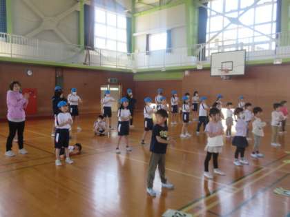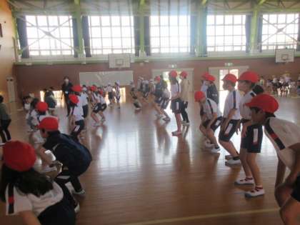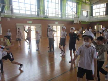 運動会で行う全校競技GentleWindのダンス練習を行いました。1・3年生の見本として腕をしっかり伸ばして大きく動いていました。