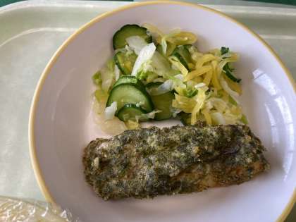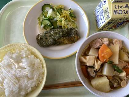 今日の献立は、ごはん、魚の磯辺揚げ、あわせ和え、筑前だき、牛乳です。