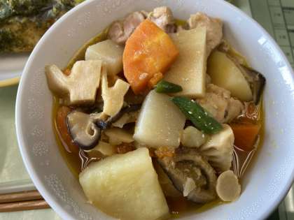 筑前だきには、鶏肉やにんじん、タケノコ、しいたけ、じゃがいもなどが入っています。