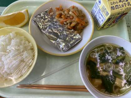 今日の献立は、ごはん、さばの銀紙焼き、大根のきんぴら、すまし汁、河内晩柑、牛乳です。