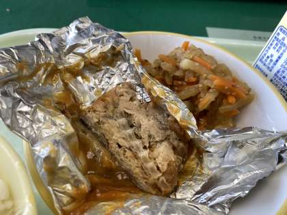 さばの銀紙焼きは、給食では定番のおかずです。骨までやわらかくなっており、全部おいしく食べられます。味噌がたっぷりついていて、ごはんにつけて食べても合います。