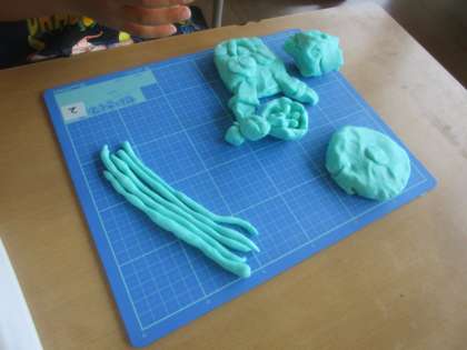手を使って粘土をひも状にした後、ひもを使ってどんなものが作れそうか考えました。