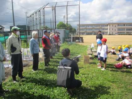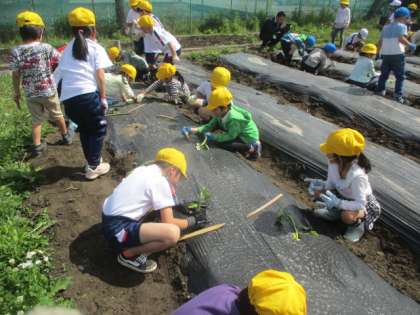 1年生と2年生合同で地域の方と一緒に野菜の苗植えを行いました。去年経験した2年生は1年生に植え方を教えるような頼もしい姿が見られました。