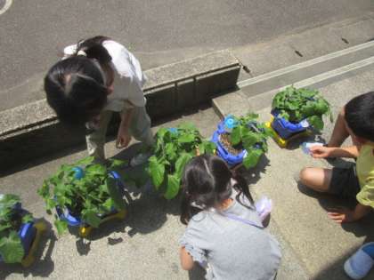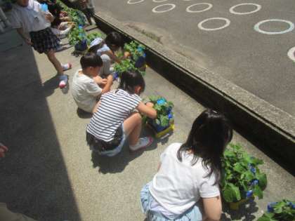 【1年生】アサガオのお世話 公開日 2023/06/07 更新日 2023/06/07 1年生 アサガオを大切に育てている1年生の子供たちです。 今日は肥料をまきました。 元気に大きくなってねという気持ちを込めていました。