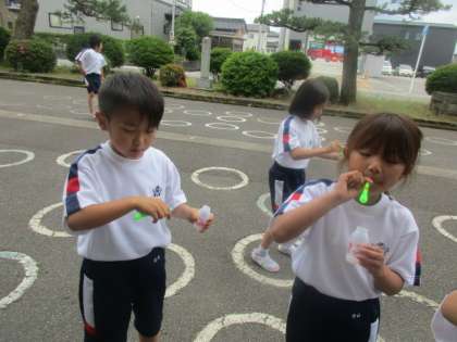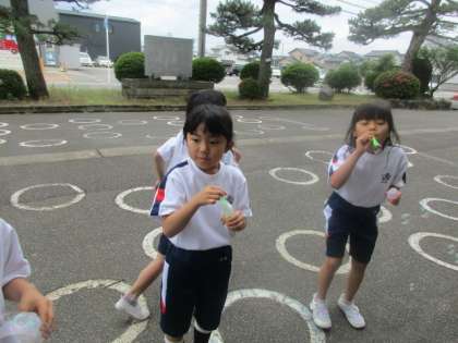 【1年生】しゃぼんだま 公開日 2023/06/12 更新日 2023/06/12 1年生 生活科では、しゃぼんだまの学習をしています。 今日は、みんなで遊びました。 シャボン玉がたくさんできて嬉しそうです。 大きさを競う子供達もいました。