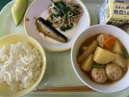 今日の献立は、ごはん、いわしの生姜味、ほうれん草のごま和え、関東だき、メロン、牛乳です。