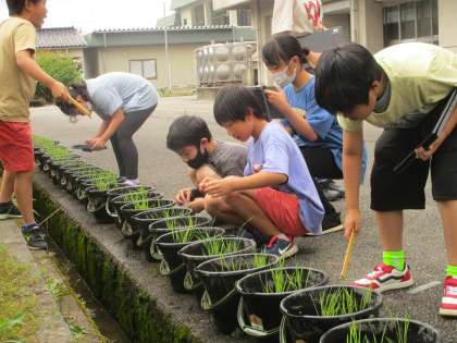 子供たち一人一人が、バケツで稲を育てています。