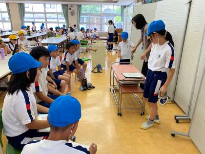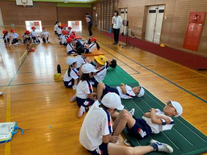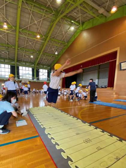 今日行った種目は、ソフトボール投げ、上体起こし、立ち幅跳び、長座体前屈、反復横跳び、握力です。20mシャトルランと50m走は、各学級の体育で測定しています。