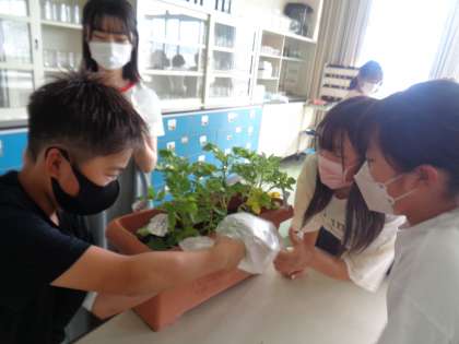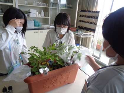 根から吸い上げられた水はどうなるのか?1つは葉のある状態で袋をかけ、もう1つは葉の無い状態にして袋をかけ…。時間が経ったら、2つの違いに驚いていました。