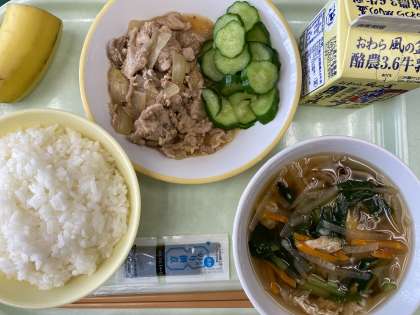 6月27日(火) 今日の給食 公開日 2023/06/27 更新日 2023/06/27 お知らせ・お願い 今日の献立は、ごはん、豚肉のジャンロー、きゅうりもみ、沢煮椀、のり佃煮、バナナ、牛乳です。 ジャンローとは、醤肉と書き、焼かずに醤油味の煮汁で柔らかくなるまで煮込む料理をいうそうです。名前のとおり、醤油の味がしみていています。ボリューム満点でした!! 今日はのり佃煮がついています。ごはんにつけて食べると、ごはんが進みます。今日もおいしくいただきました!