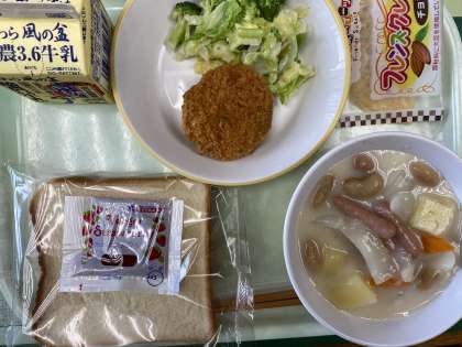 6月30日(金) 今日の給食 公開日 2023/06/30 更新日 2023/06/30 お知らせ・お願い 今日の献立は、食パン、メンチカツ、グリーンサラダ、白花豆の米粉シチュー、いちごジャム、牛乳です。 メンチカツはさくさくです。グリーンサラダは、コーンクリーミードレッシングであえてあります。 今日は、6月日誕生ランチです!6月生まれの人には、クレープのデザートがついています。 今日もおいしくいただきました!
