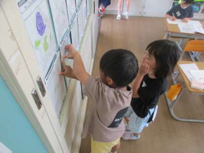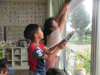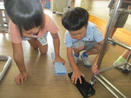 いろいろなものの長さを任意単位を用いて測っています。 二人で協力しています。