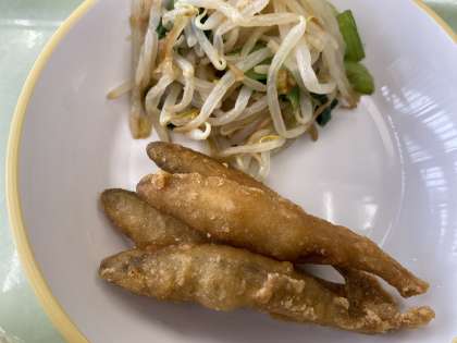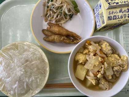 今日の献立は、ごはん、わかさぎのフリッター、香味あえ、高野豆腐の卵とじ、牛乳です。