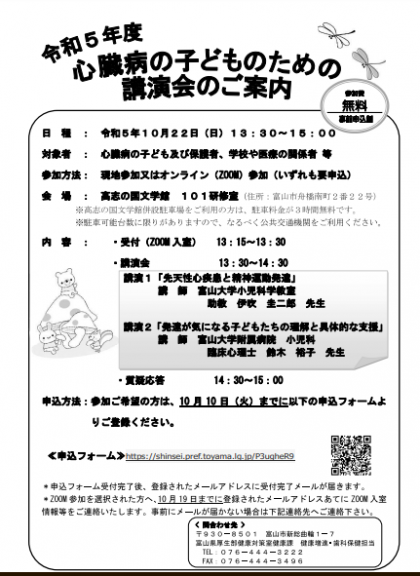 心臓病の子供のための講演会について 公開日 2023/09/04 更新日 2023/09/04 お知らせ・お願い 富山市教育委員会から講演会のお知らせです。 参加を希望される方は、10月10日(火)までに、申込みフォームより直接お申し込みください。 <申込みフォーム> https://shinsei.pref.toyama.lg.jp/SksJuminWeb/EntryForm?id=P3ugheR9