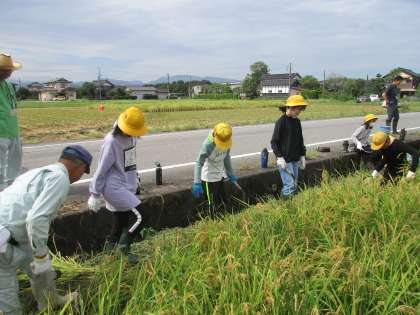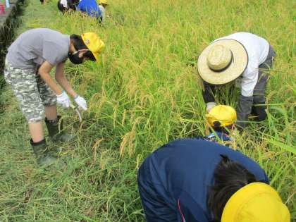 稲刈りのポイントを聞き、実際に刈り始めました。