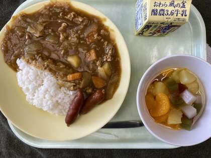 9月13日(水) 今日の給食 公開日 2023/09/13 更新日 2023/09/13 お知らせ・お願い 今日の献立は、カレーライス(ごはん)あらびきウインナー、フルーツカクテル、牛乳です。 今日はカレーライス。子供たちに一番人気の献立です。甘口と辛口を混ぜたルウは子供たちに丁度よい味になっていると感じました。フルーツカクテルは、さっぱりした甘さでした。 今日もおいしくいただきました!