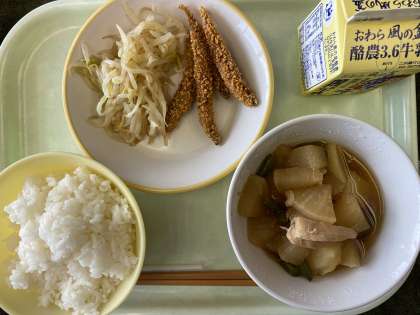 9月25日(月) 今日の給食 公開日 2023/09/25 更新日 2023/09/25 お知らせ・お願い 今日の献立は、ごはん、きびなごのさくさく揚げ、甘酢和え、大根と鶏肉の中華煮、牛乳です。 大根と鶏肉の中華煮は、中華スープ、オイスターソース等で味付けられています。豊富な種類の具、一つ一つに味がしみています。きびなごはその名の通り、さくさくでした。 今日もおいしくいただきました!