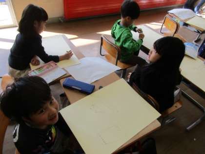 【1年生】おはなしからうまれたよ 公開日 2023/10/11 更新日 2023/10/11 1年生 図工の様子です。 「くじらぐも」「おおきなかぶ」「おむすびころりん」の中から好きなお話を選んで、想像を膨らませながら絵を仕上げています。