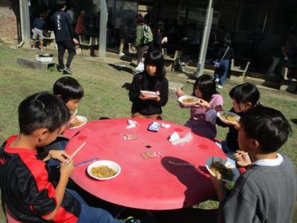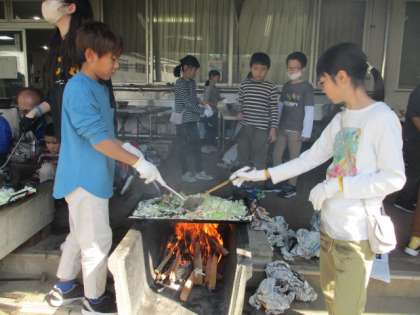 野外炊飯では、焼きそばづくりを行いました。野菜を切る、火をつける、具材を混ぜるなどの作業過程をみんなで分担しながら、手際よく行う班が多くありました。自分たちで作った焼きそばは格別においしかったようです。「こんなおいしい焼きそば初めて!」「野菜苦手だけど、これなら食べられそう!」と協力してやり遂げたことに達成感を味わっている様子でした。